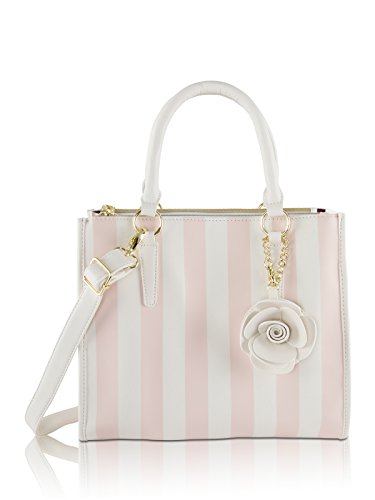 -. Feature : Triple Compartment Tote, Hanging Rose charm key-chain dangle, Gold color hardware / Top handles with 6" drop, includes detachable adjustable cross-body strap with 25" drop, allows it being carried over your shoulder or hand / 2 Top zipper compartments and center pocket with magnetic closure / Fully lined interior, 2 back wall slip pockets and 1 zipper pocket / Tote: 12" x 10" x 6" (WxHxD)