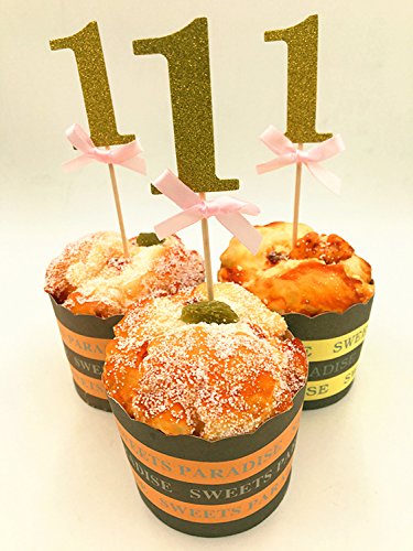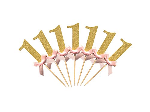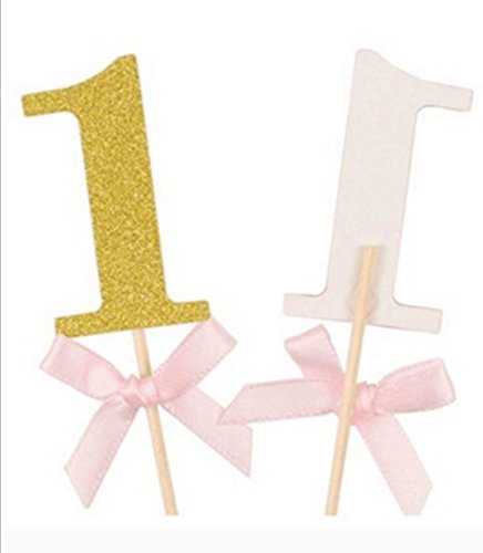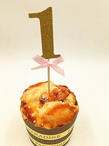 Babycola's Mum 20Pcs Glitter Gold With Pink Ribbon Bow 1st Birthday Decorations , Number Cupcake Toppers, Party Cake Cupcake Decorative Toppers