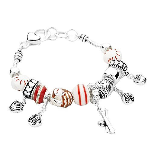 -. Feature : Stunning stylized Bead Bracelet highlighted with a beautiful dangling baseball theme charms / Fashion trending Pearl, Filigree beads and dangling heart charms / Large Lobster Heart Closure with adjustable 3 Rings for length / Size: 7" length Perfect for Medium size wrist with adjustable closure / This darling baseball bracelet features white and red beads and and brown enamel baseball mit such a lovely bracelet