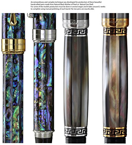 -. Feature : Solid brass barrel and cap with inlay of natural Sea Shell (Abalone). Sea Shell is a natural material; therefore, some distinctions in the texture of the Sea Shell (Abalone) material may occur. / Distinctions and variations in texture of the natural materials are not defects, but rather natural attributes which add beauty and uniqueness to each of these handcrafted pens. The sea shell panels range from dark green to black, along with red or blue overtones. Please see all images and understand that colors of Sea Shell inlay may vary from pen to pen. There are no two pens alike. / Supplied with gift box, (4) ink cartridges, cloth, ink converter, certificate and 3 year warranty card. German-made medium point stainless steel nib. Ink refill is standard European (international) size and is selectively interchangeable with a variety of commercially available fountain ink refills including montblanc, parker, cross, waterman, schmidt, sheaffer, s.t. dupont, visconti, pelikan, dunhill, delta, krone, omas, ancora and . / Screw-on cap. .999 Platinum plated brass fittings. Limited edition. Each pen is individually numbered / Diameter: 12 mm, Length posted: 170 mm, Length capped: 145 mm; Weight: 40 grams/1.4 oz.