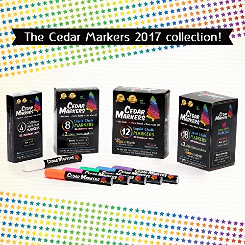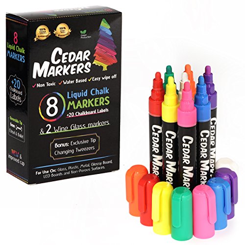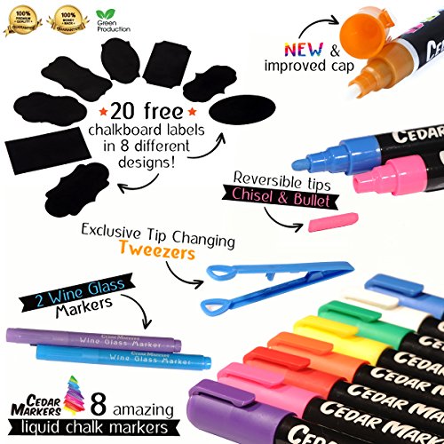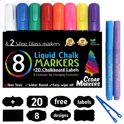 Cedar Markers Liquid Chalk Markers - 8 Pack With 2 Free Wine Glass Markers and 20 Chalkboard Labels. Amazing Neon Color Pens. Reversible Bullet And Chisel Tip And A Brand New Revolutionary Cap.