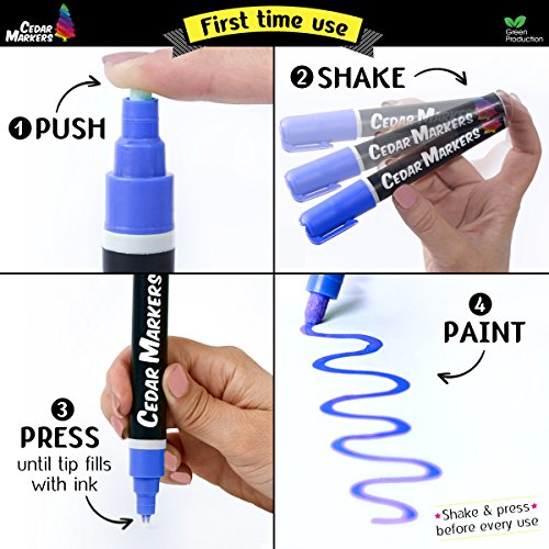 AMAZING NEON COLORS - Cedar Markers™ liquid chalk markers use unique ink that brings colors to life. Our fluorescent colors will spark your creativity. Perfect for use on Menu Boards, Chalkboard Labels, Chalkboard Paper, Bistro Boards, House Windows, Car Windows, Glossy Boards, Mirrors, Plastic, Metal and more. Cedar Markers is an Amazon registered brand. Be sure you are buying from an authorized seller.