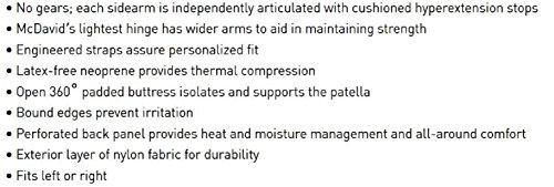 -. Feature : Geared polycentric hinge for maximum mobility and maximum protection / Four adjustable elastic crossing straps that offer additional support aiding in rehabilitation / Molded condyle pads for better fit and comfort / Fits right or left knee