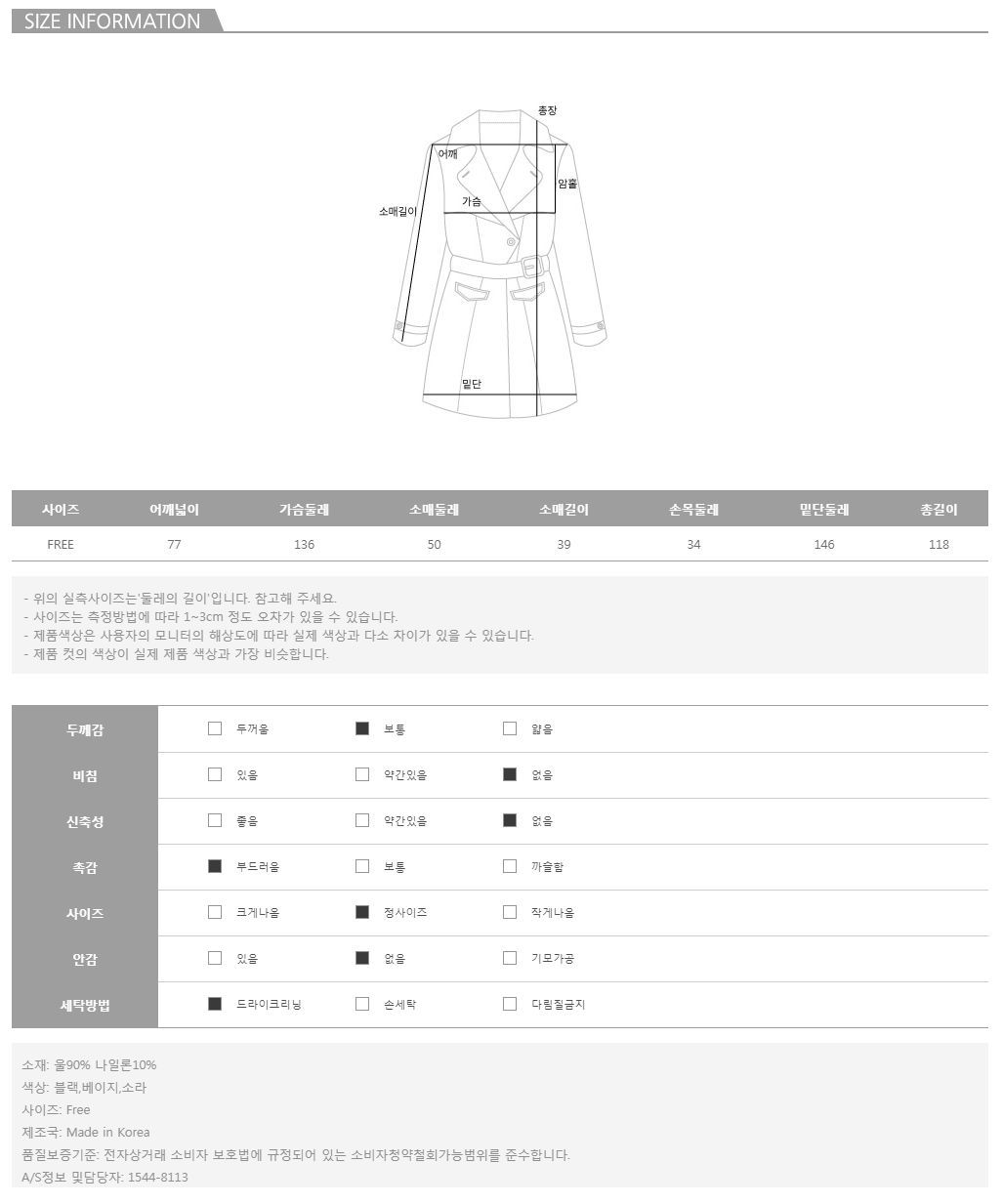 혼용률 90%의 울 소재로 톡톡한 보온 효과를 자랑하는 아우터예요 :)