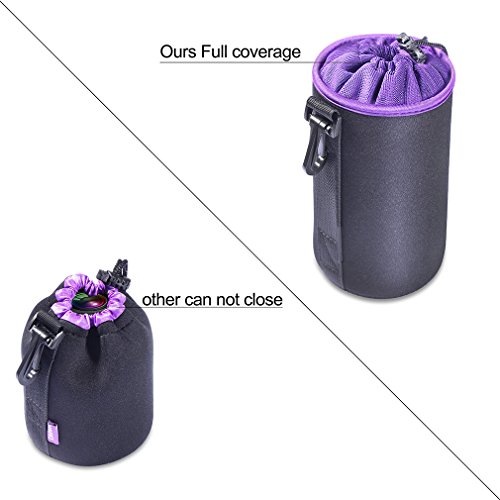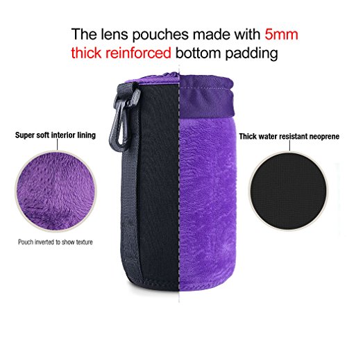 Functions&Portability: Thick Waterproof Neoprene Protects against Moisture, Sand, Dust, and Accidental Bumps or Scratches. Hook allows you to attach the lens pouch anywhere with a ring (such as camera bags and backpacks) rather than being crowded with other accessories, making it an ideal choice for lens protectors