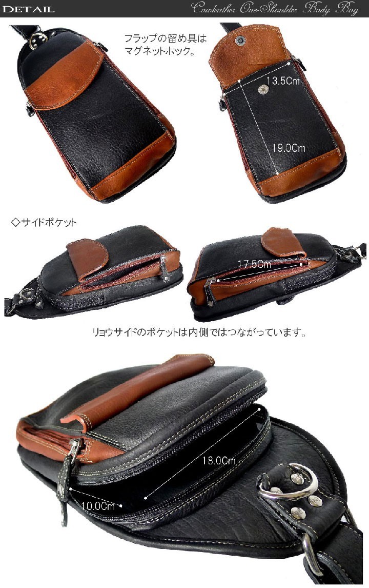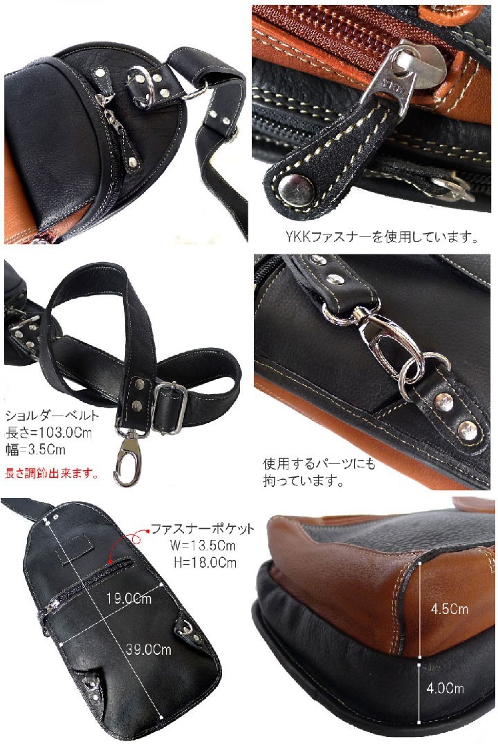 Deep Zone ワイルドでセクシーを上品にまとめる男のレザーブランド。 自分買いからプレゼントにも人気でオススメです。一流革職人がハンドメイドで仕上げられた、 本革 レザー ボディバッグ、ワンショルダーバッグ【素材】 牛革 金具:合金製 【サイズ】高さ:約39.0cm 幅:約19.0cm 【カラー】ブラウンxブラックキメの細かい肌触りの良い牛革を使用して、手作り感溢れるハンドメイドレザーボディバッグ。前面にフラップが付き両サイドにファスナーポケットが有ります、ブラックとブラウンのバイカラーワイルドに作成されたメインポケットは、長財布等普段持ち歩く小物も余裕をもって収納可能。普段持ち歩く小物をスタイリッシュに持ち運びできます。ショルダーベルトは長さ調整は可能。またアタッチメントで左右お好みのほうに取り付け可能です。シンプルマインドに可愛さと大人の高級感を表現してます。本革 メンズ レザー ボディバッグ ワンショルダーバッグ 男女兼用