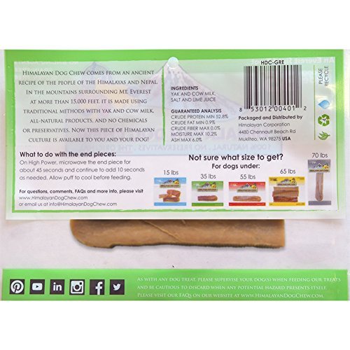 Studio : Himalayan Dog Chew Publisher : Himalayan Dog Chew Binding : Grocery Product Description The Original Himalayan Dog Chew is a very long lasting dog chew. Himalayan Dog Chews are made by boiling yak and cow milk and then dried for several weeks to create a hard chew. Dogs must work the end of the treat for hours, softening it with their mouths before small parts of it can be slowly scraped off. It is 100-percent natural with no preservatives. It is an authentic type of cheese eaten by the people of the Himalayas. When you give this Himalayan Dog Chew to your dog, you know that you are providing them with hours of high quality eating entertainment. Packaged by weight, quantities and size vary. 0