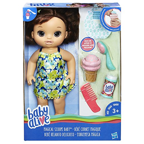 Share a sweet experience with the Baby Alive Magical Scoops Baby doll! Girls and boys can have fun preparing the pretend ice cream cone for their baby to eat. Press the scooper against the cone to begin making her snack. Pretend to add toppings, too -- shake the sprinkles shaker to hear a fun noise. Press the ice cream cone against the doll's mouth. . .all gone! The scoop retracts into the cone so kids can pretend she's eaten all of her yummy dessert. Press the cone again and again to play out lots of sweet times together. Pretend to wipe her face after her tasty treat using the included bib. The Magical Scoops Baby doll also comes with a comb for brushing her rooted hair before or after enjoying her cone. Baby Alive and all related properties are trademarks of Hasbro.Feature