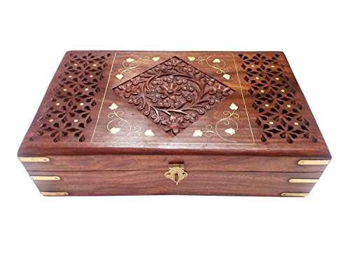 -. Binding : Kitchen -. Brand : Whopper India -. Color : Brown -. EAN : 0736631444059 -. Feature : The box comes with a velvet inner lining and a brass latch to keep the contents scratches free and secure. / Handmade by skilled artisans from Saharanpur - India's largest hub for high quality wooden handicrafts. / Crafted using the finest richly hued timber Rosewood and further adorned with an exquisite brass inlay of Double elephant motifs and a hand carved floral trellis border. / Store your valuables like personal jewelry or family heirlooms and add a touch of class to your dressing table. / Dimensions: Length - 10 inches; Width - 6 inches; Height - 2.5 inches -. IsAutographed : 0 -. Label : Whopper India -. Manufacturer : Whopper India -. Model : whopperindia -. MPN : WhopperIndia -. PartNumber : WhopperIndia -. ProductGroup : Home -. ProductTypeName : HOME -. Publisher : Whopper India -. Studio : Whopper India -. Title : Wooden Jewelry Box, Carving Inlay Jali Work Storage Box, 10X6 inch Vintage Box., Keepsafe Box. -. UPC : 736631444059