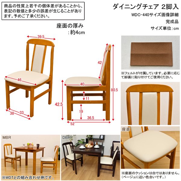 本商品はお取り寄せ商品のため、稀にご注文入れ違い等により欠品・遅延となる場合がございます。誠に恐れ入りますが、何卒ご了承ください。 また、以下の場合には追加送料がかかる場合がございます。  ・大型商品の複数購入時 ・同梱区分が異なる商品の複数購入時  【出荷目安】:1 - 4営業日 ※土日・祝除く 【同梱区分】:TS 1490 【梱包サイズ】:大型商品 【代引き決済】:不可  配送伝票の依頼主は出荷元(メーカーもしくは仕入元)名となる場合がございますので、お受け取りの際はご注意ください。   【型番】WDC440  【商品名の色やサイズについて】 こちらは「ダイニングチェア 【2脚セット】 合成皮革/木製 ダークブラウン」の商品ページです。商品画像や商品情報には、色違いやサイズ違いの商品が載っている場合がございます。ご注文前に色・サイズ・セット内容のご確認をお願いいたします。  優しいデザインとナチュラルな色合いがあわせやすく使いやすいダイニングチェアーです。 座面は合成皮革となっておりますので、お手入れ楽々♪  別売りでお揃いのダイニングテーブル(2サイズ)もございます(WDT-750、WDT-1200)  チェア:幅460×奥行520×高さ805mm 座面高:425mm 重量:5.1kg 完成品 テーブル:天然木ラバーウッド ラッカー塗装 チェア:天然木ラバーウッド ラッカー塗装 座面・背/合成皮革・ウレタンフォーム 原産国:ベトナム  【ご注意事項】 ※本商品は、北海道・沖縄・離島への配送はいたしかねます。あらかじめご了承ください。