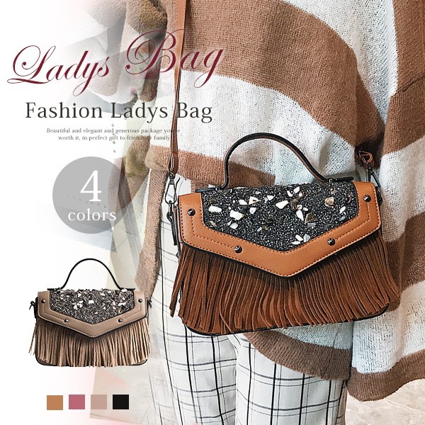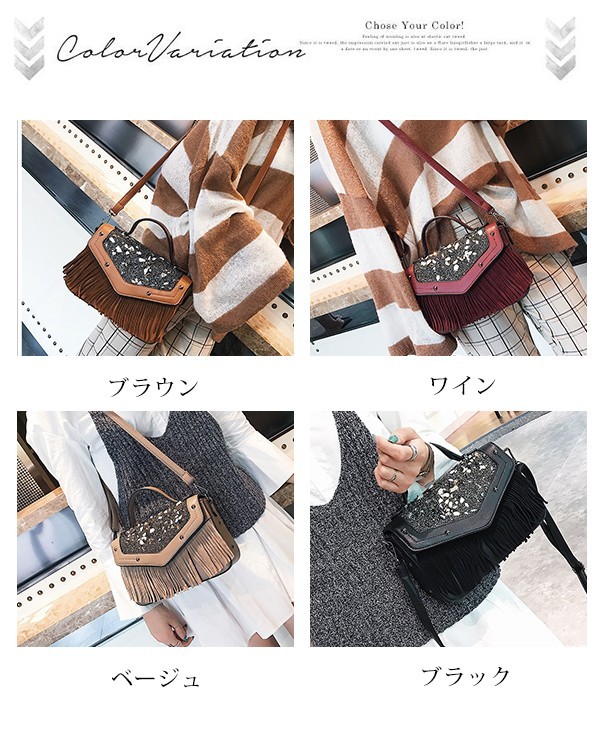 バッグ フリンジ レディース 肩掛け ハンドバッグ ミニ チェーン かばん 斜めがけ ポシェット マザーズバッグ トートバッグ ママバッグ ショルダー 手提げ 巾着 鞄 パーティーバッグ商品詳細■サイズ:高さ:約16cm/横幅:約23cm/厚さ:約8cm/ショルダー125cm■素材: 合成皮革人気の小さめバッグは内ポケットもついており見た目よりも収納力があります。普段使いからお出かけやパーティなどに使える上品なデザインです。★備考●測り位置や測り方によって2-4cm誤差があり、予めご了承してください。●お品物の色合いは撮影環境、PCパソコン画面の表示環境により、若干異なる場合がございますので、予めご了承してください。●製造上、留め口、金具(マグネット)部分に小さいキズがある場合があります、予めご了承してください。●素材のため、お届けの際に臭いがある場合がございますが、数日干していただけますと軽減します。●通常8~10日間お届けます。