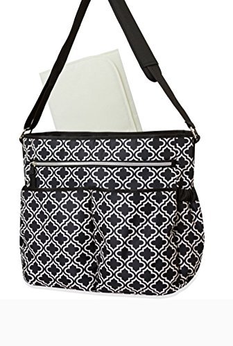 8 PIECE SET: Diaper bag , Large pouch , Mid size pouch , Small pouch , Wipe case , Bottle warmer , Changing pad , Diaper clutch. Stash all baby's needs in this great-looking Cross body Diaper Bag by Baby Essentials. The black and white, damask-inspired geometric print makes it a fun fashion statement, and the multiple pockets, inside and out, keep you organized. Easy-care fabric is used throughout, and a wipe-clean changer is included. The adjustable, padded strap lets you tote it all in comfort, so every day on the go with baby is a pleasure.Feature