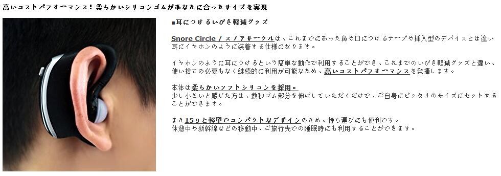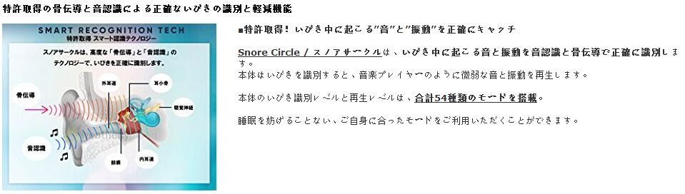 ・日本で2,000万人の人がいびきをかく?日本国内では約2,000万人が習慣的にいびきをかいていると言われています。つまり、5人に1人はいびきをかいていると言われてます。いびきの要因は様々ですが、主に睡眠中に喉の筋肉が緩み気道が狭くなってしまうことや加齢の進行(老化)によって首や口などの器官の周りの筋肉が衰えていくことが要因と言われています。起床中にいびきをかかないのは、目覚めることでこの喉の筋肉が引き締まることが関係していると言われ、いびきをかいている時に物音や外から肩を叩かれたりするといびきが止まるのも同様な要因だと言われます。◇耳装着イヤホン型 いびき軽減スマートツール登場!◇睡眠中に起こる ”いびき” を独自のテクノロジーセンサーの ”音認識” と ”骨伝導” によって正確に識別し、いびきを軽減するスマートツールデバイスです。いびきの識別だけではなく睡眠中の ”深い睡眠”、”浅い睡眠”、”ほぼ起きている状態” などの睡眠サイクルも計測することができます。Bluetooth SMART(4.0)を搭載。睡眠データを専用アプリにかんたんに転送することができます。当日のいびきの状態や睡眠サイクルなどの情報をアプリケーションで閲覧・管理することが可能です。