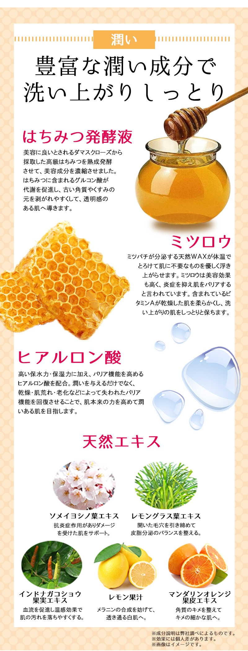 成分表 トリ(カプリル酸/カプリン酸)グリセリル、パルミチン酸エチルヘキシル、トリイソステアリン酸PEG-20グリセリル、パラフィン、マイクロクリスタリンワックス、セレシン、ミツロウ、水、BG、加水分解ヒアルロン酸アルキル(C12−13)グリセリル、レモン果汁、グルコノバクター/はちみつ発酵液、マンダリンオレンジ果皮エキス、ソメイヨシノ葉エキス、ヒアルロン酸ヒドロキシプロピルトリモニウム、インドナガコショウ果実エキス、レモングラス葉/茎エキス、オレンジ果皮油、トコフェロール、フェノキシエタノール