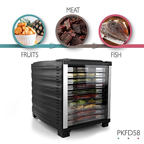 Multi-Tier Kitchen Dehydrator Prepare Healthy & Nutritional Snacks for All Ages Dehydrates Food for Enhanced Preservation Simple Button Operation with Nutritious Results Faster & More Efficient Alternative to Food Storage Effectively Dries Food by Removing Moisture Content Dehydration Process Retains up to 97% of Vitamins & Minerals (10) Slide-Out Tier Trays for Enhanced Air-Flow Convenient Easy-Access Glass Door Panel Scientifically Tested to Increase Food Shelf Life Temperature Adjustable Control Settings Safe for Placement on Any Table or Countertop Used for Meat, Fish, Poultry, Fruits, Vegetables and More Stain Resistant & Easy-to-Clean