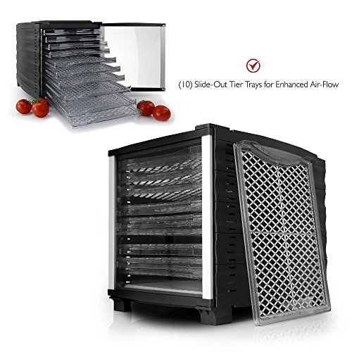 SLIDE OUT TRAYS: Comes with 10 removable slide out food trays or dryer trays. These trays can also be used to dry food without the use of the dehydrator. Since the trays are removable, they are very easy to clean including the dehydrating machine.