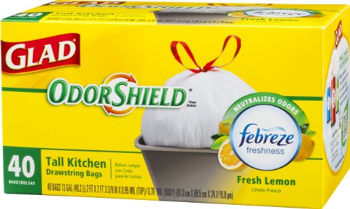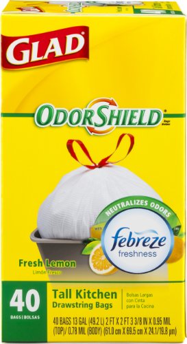 40 count box of 13 gallon kitchen trash bags in lemon scent. Packaging may vary.