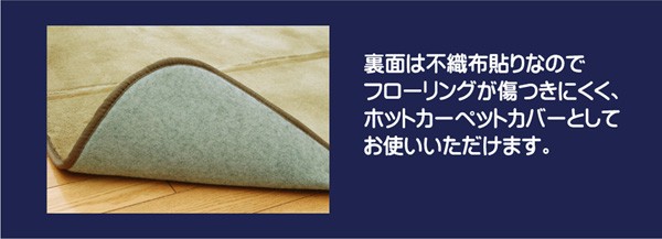 表地には吸湿発熱機能がある新機能複合素材『ルネス』を使用しています。ルネスの機能として(1)吸湿発熱効果。体から放出される湿気を吸収して発熱します。(2)抗菌防臭効果。『キトサン』を練り込んでいますので繊維に発生する菌の増殖を抑え、不快なにおいの発生を防止します。(3)消臭効果。嫌なにおいの元となる酢酸、イソ吉草酸、ノネナールを減少させます。等の効果があります。中材にはウレタンを使用していますので適度がクッション性があります。フローリングを傷つけにくいよう、裏には不織布を貼っています。電気カーペットカバーとしてもご使用頂けます。