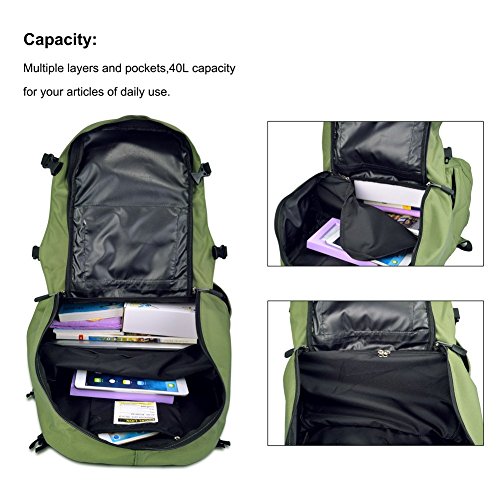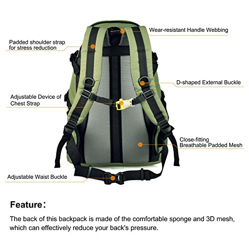 -. Feature : Made of waterproof,wear-resistant and durable material / Thickened shoulder straps,comfortable and breathable / High-quality waistband,zipper and D-shaped buckles,easy to close and open / Multiple layers and pockets,40L capacity for your articles of daily use / Suitable to carry for outdoor mountain climbing and travelling
