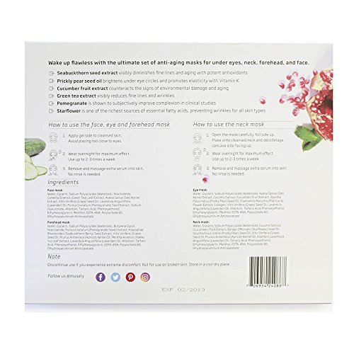 Wake up flawless with the ultimate set of anti-aging masks for eye, neck, forehead and face. 2 face masks,4 pairs of eye masks,2 forehead masks,2 neck masks.