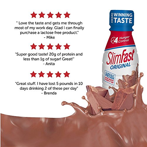 -. Binding : Health and Beauty -. Brand : Slim-Fast -. EAN : 0008346740017 -. Feature : COMPLETE MEAL REPLACEMENT SHAKE: The SlimFast Original Ready to Drink meal replacement shake is a balanced formula that is packed with 10g of protein, 5g of fiber, and 24 essential vitamins and minerals / 4 HOUR HUNGER CONTROL: SlimFast meal replacement shakes have helped millions of people lose pounds by reducing those annoying hunger cravings for up to four hours. It contains 200 calories in each 8 fluid ounce serving, giving you plenty of energy / GREAT TASTE - SlimFast has received multiple awards from Men's Health and OK! Magazine as the Chef's Best Taste Award for its exceptional-tasting formula. This ready-to-drink weight loss shake can also be used as an ingredient in several recipes / REPLACE TWO MEALS PER DAY: One 11 fluid oz. bottle contains a third of your recommended daily intake of most essential vitamins and minerals. This keeps your body running strong during the day / PART OF THE SLIMFAST PLAN - The SlimFast Plan offers flexibility and simplicity to make losing weight as easy as 1 - 2 - 3. This clinically proven process helps you lose weight fast and keep it off -. IsAdultProduct : 0 -. Label : Spartan Nash Company (US HPC) -. Manufacturer : Spartan Nash Company (US HPC) -. MPN : 205192 -. NumberOfItems : 1 -. PackageQuantity : 1 -. PartNumber : 205192 -. ProductGroup : Health and Beauty -. ProductTypeName : HEALTH_PERSONAL_CARE -. PublicationDate : 2017-09-01 -. Publisher : Spartan Nash Company (US HPC) -. ReleaseDate : 2017-09-01 -. Studio : Spartan Nash Company (US HPC) -. Title : SlimFast Original - Weight Loss Meal Replacement RTD Shakes - With 10g Of Protein & 5g Of Fiber - Plus 24 Vitamins and Minerals per serving - Creamy Milk Chocolate, 4 Count -. UPC : 008346740017