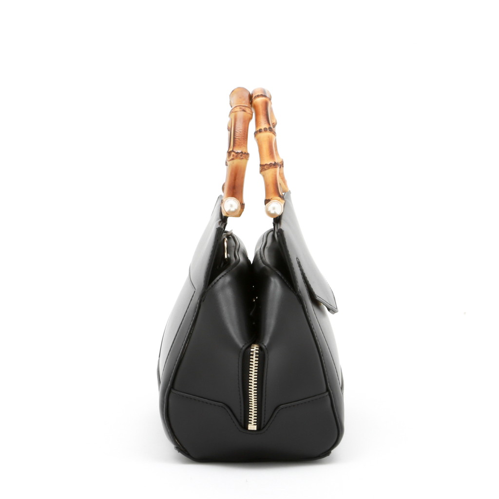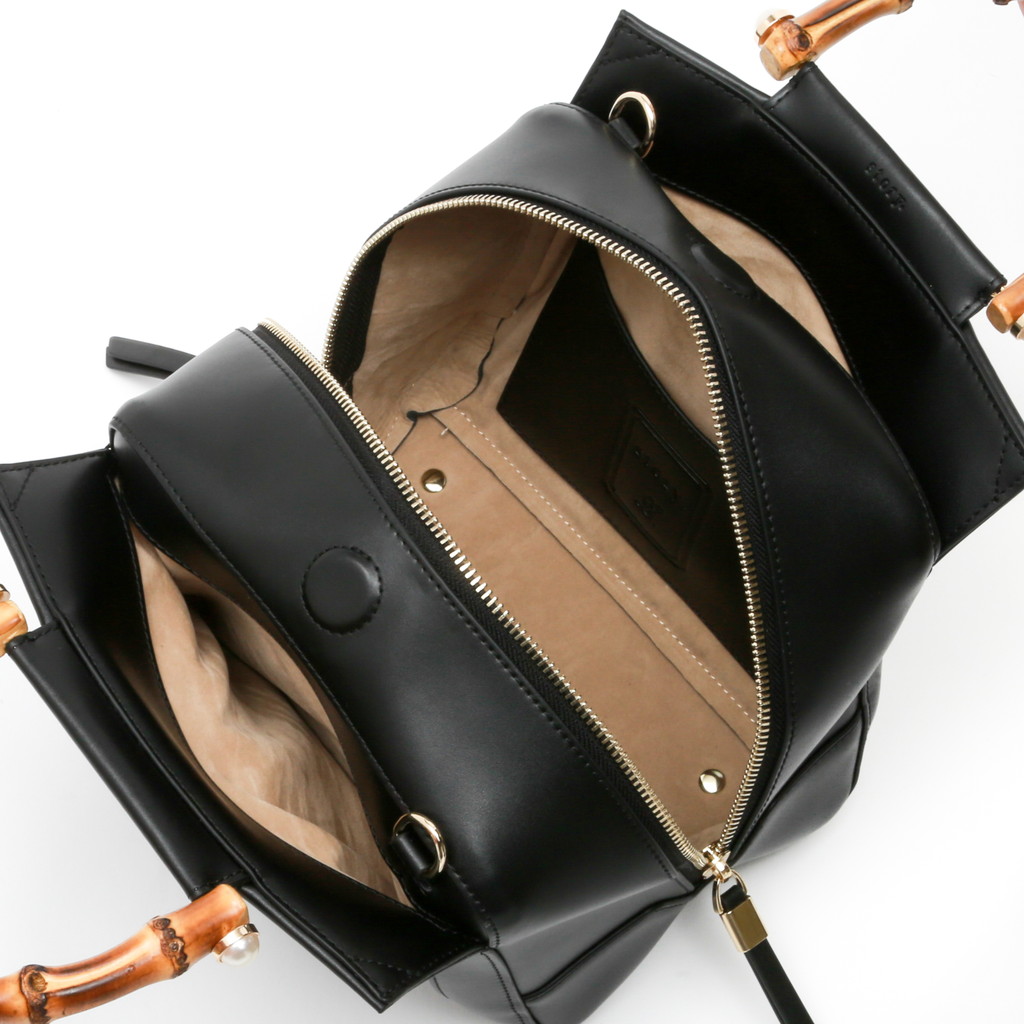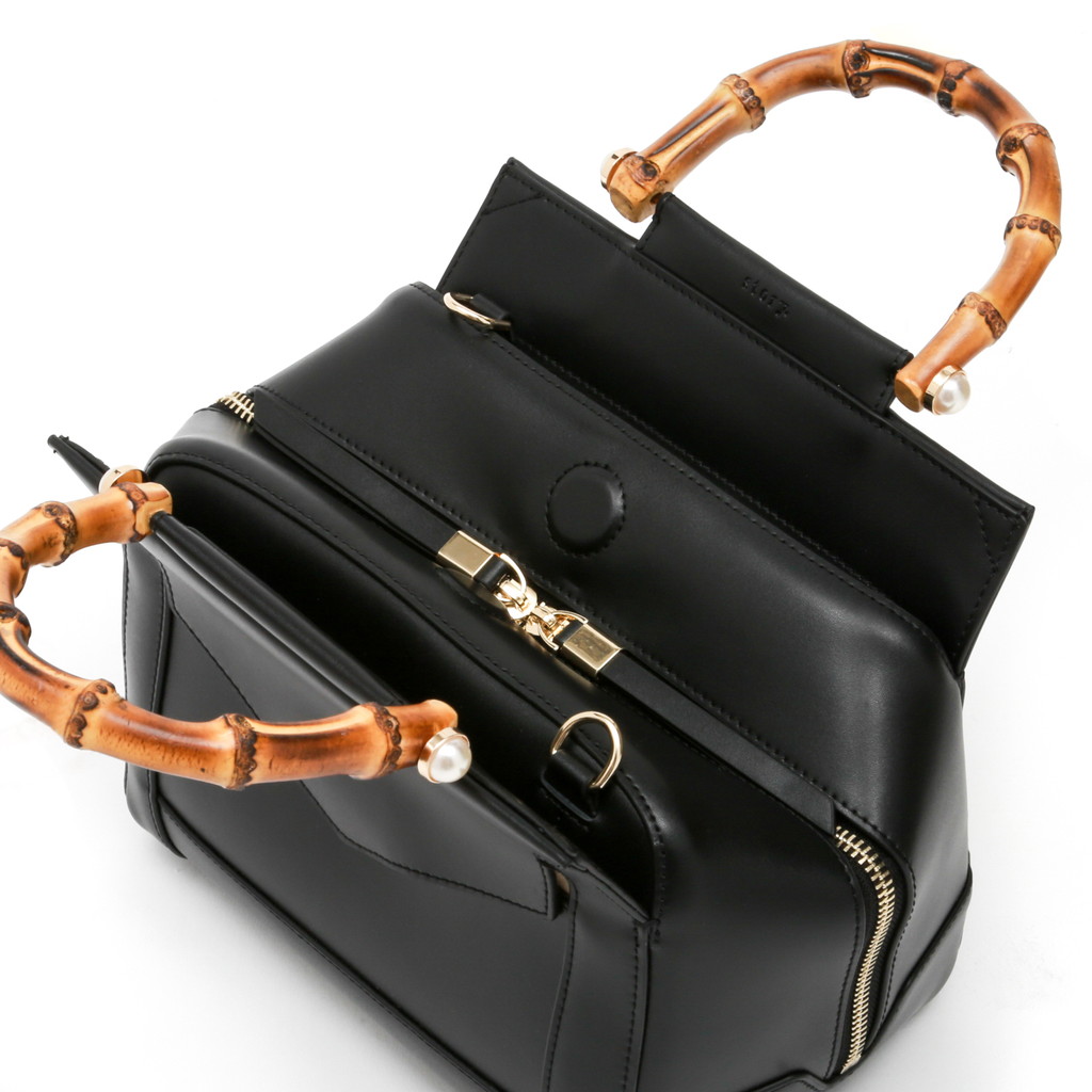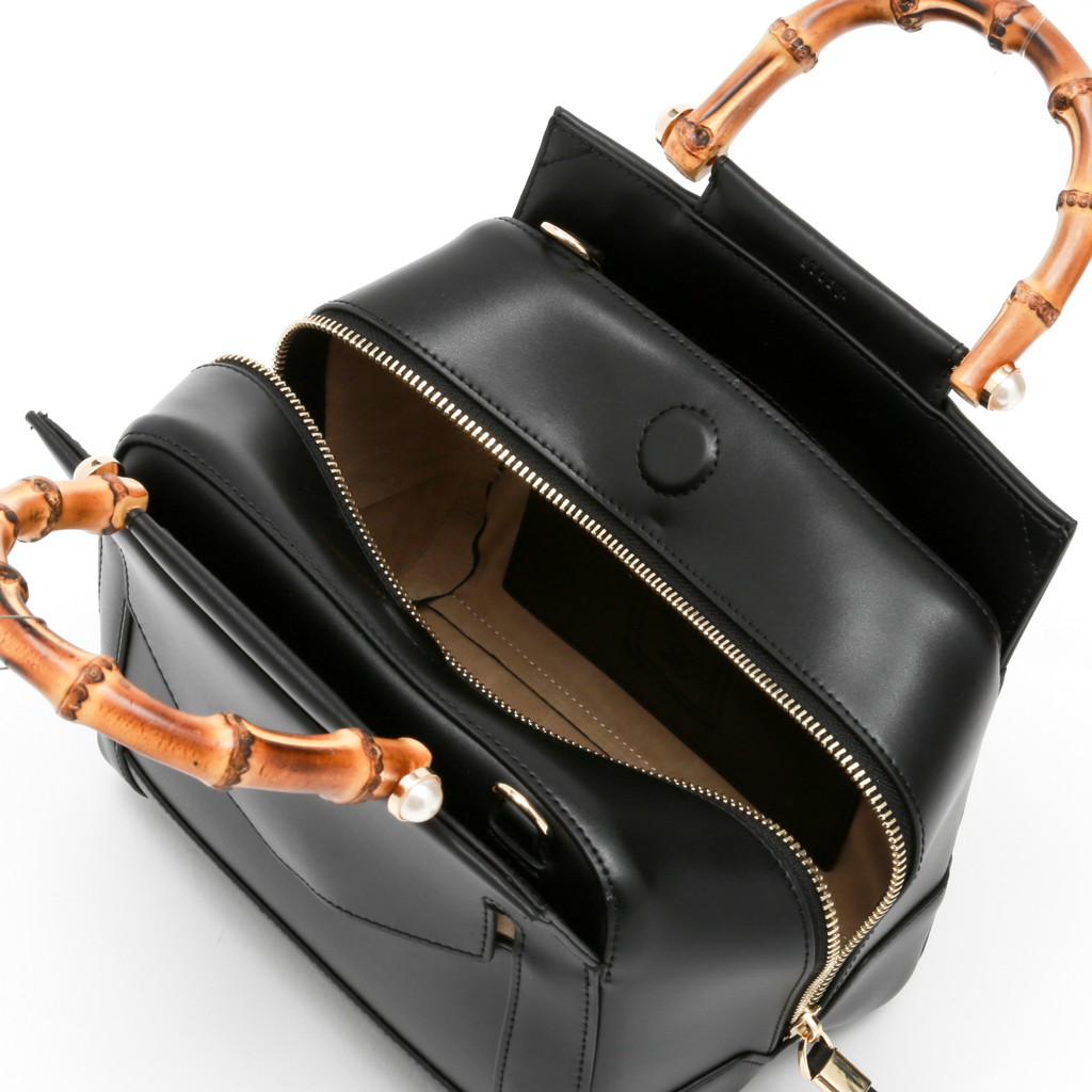 バンブーハンドルにパールを組み合わせたレディライクなミニボストン。淡い光沢を纏ったレザーが控えめでラグジュアリーな魅力に富んでいます。また、フロントの大きなポケットや内側のセパレートポケットなど機能的なデザインもポイント。調節可能なショルダーで、肩から上品に掛けたり、クロスボディとしてもご使用いただけます。