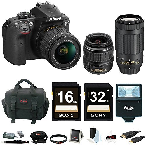 -. Feature : Bundle Includes: Nikon D3400 24.2MP DSLR Camera with 18-55mm and 70-300mm NIKKOR Lenses / Sony 16GB Memory Card and Sony 32GB Memory Card / Digital Slave Flash / Focus Accessories Bundle / Nikon Authorized Dealer - Includes USA Manufacturer's Warranty / Wide 100-25,600 ISO Sensitivity for Clear Pictures in the Day or Night / EXPEED 4 Image Processor / Bluetooth and SnapBridge Software for Instant Sharing