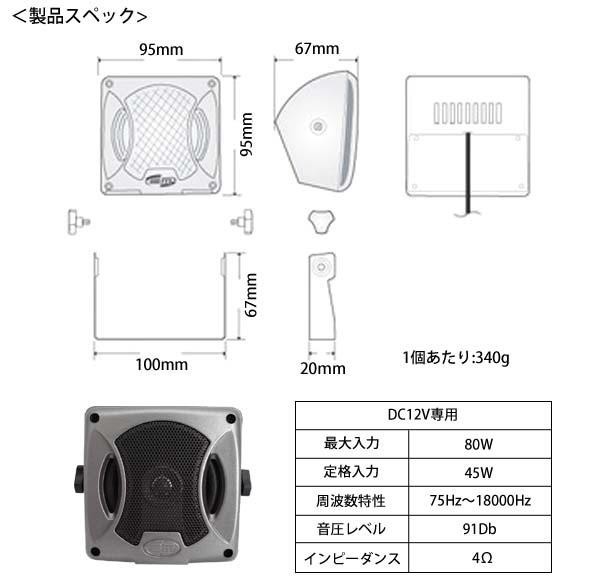 | 仕様 | DC12V専用 最大入力:80W 定格入力:45W 周波数特性:75Hz~18000Hz 音圧レベル:91Db インピーダンス:4Ω パッケージ裏に取扱説明有り |