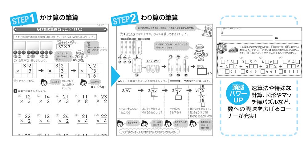【Target】 ● Complete acquisition of multiplication by division and division of quotient ● Complete mastery of division · minority basis understanding ● digit counting of large number ● posture finding solving method by your own head 【Features】 ● Easy understanding learning and plentiful