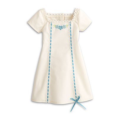 - A nightgown with embroidered flowers at the chest and two rows of blue ribbon, woven through lacework on the front and finished off with a bow