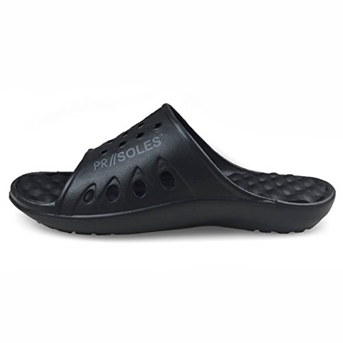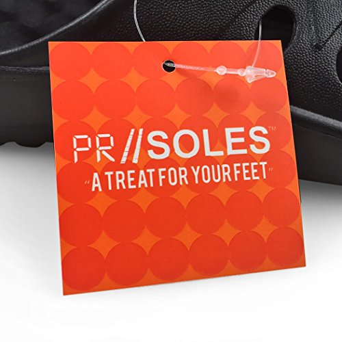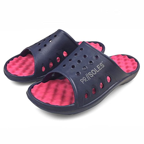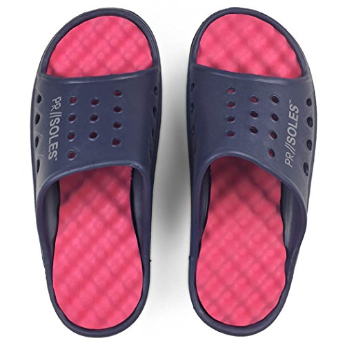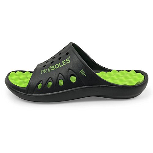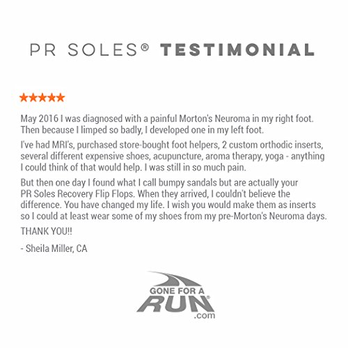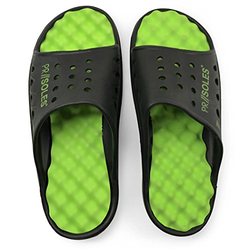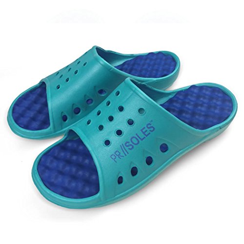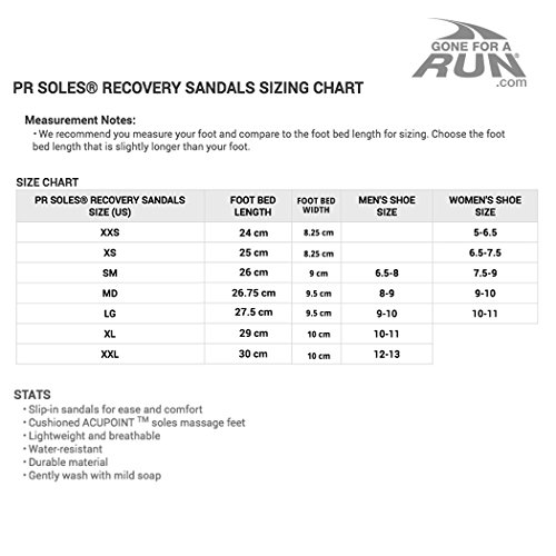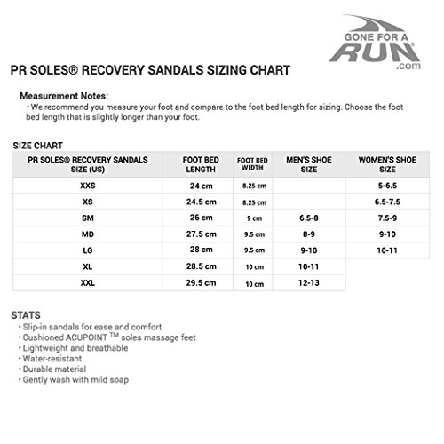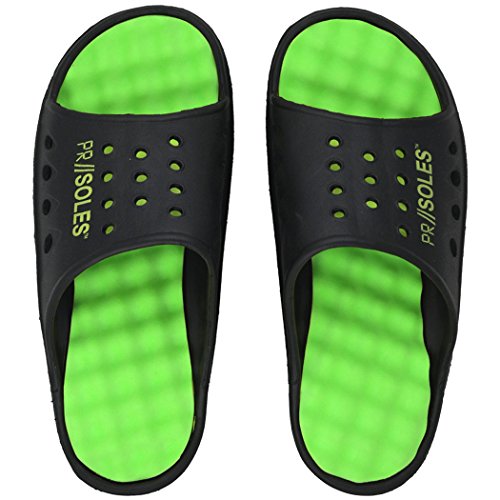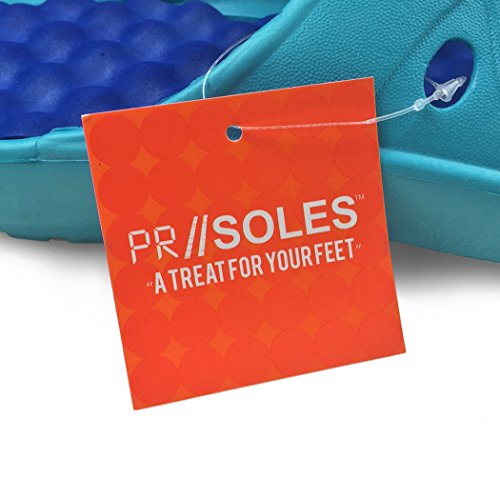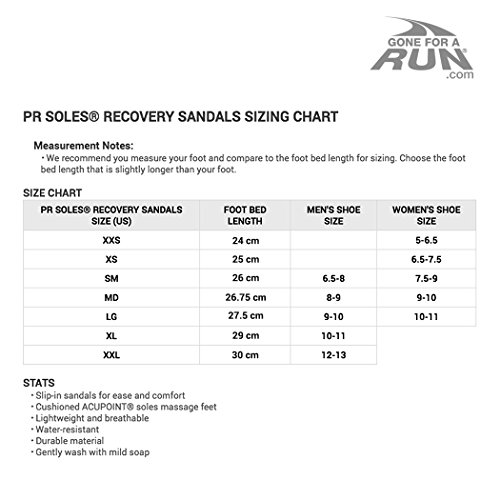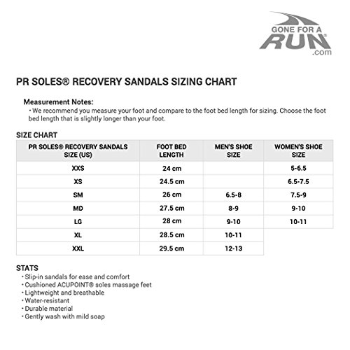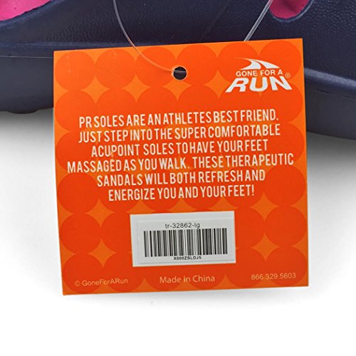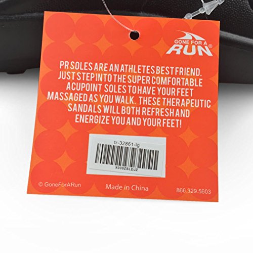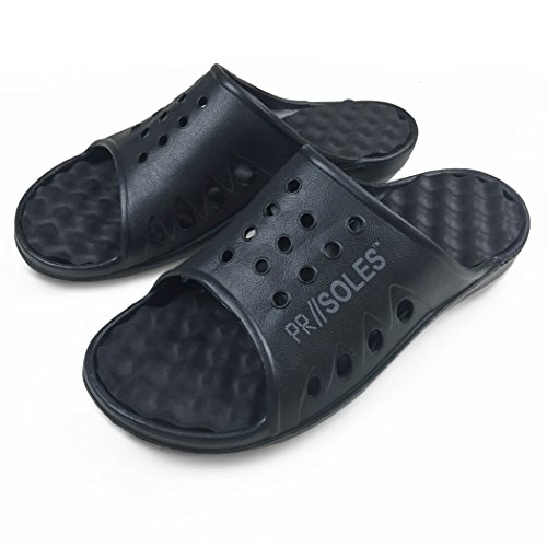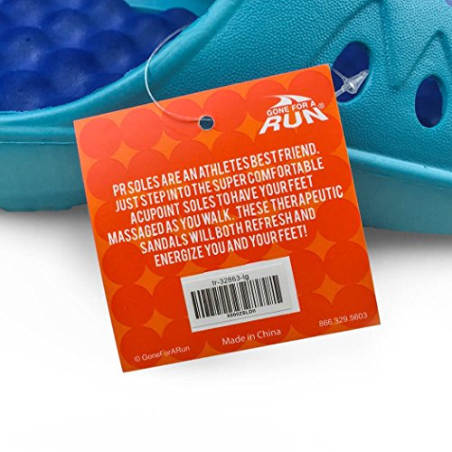 Binding : Apparel Product Description PR SOLES are specifically designed for runners to provide the most comfortable footwear for before or after a run to promote recovery of sore and tired feet. Just step into these super comfortable flip flops featuring ACUPOINT soles to have your feet massaged as you walk. PR SOLES are lightweight, breathable, waterproof and feature our unique foam cushioned ACUPOINT soles for ultimate massaging comfort that both refresh and energize your feet. How Do PR SOLES Work? The unique raised triggers on the ACUPOINT soles activate nerve endings in the feet that send healing relief through the entire body. These triggers are specially designed to massage your feet improving circulation and breaking up painful lactic acid and uric acid that accumulate in the feet after a run or any extended time on your feet. Recover Faster and Smarter By slipping on PR SOLES after a run or activity, the triggers will immediately engage your feet to increase circulation and nerve stimulation which benefits the entire body. Here are just a few of the benefits of applying massaging action to the feet: 1. Improves circulation by stimulating blood flow, which will refresh the feet and legs. 2. Breaks up accumulated wastes such as lactic and uric acid in the feet. 3. Alleviates foot, leg and lower back pain. 4. Reduces swelling and tension. 5. Stimulates nerve endings benefiting the entire body. 6. Feet and legs recover faster. First Use When wearing PR SOLES for the first time, some people may experience slight "ouchies" from the massage trigger points. This is normal for some feet to initially feel a little sensitive. Your feet will adapt quickly and you will soon be saying "ahhh..." 0