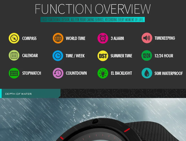 Feature:Complete Calendar,Shock Resistant,Week Display,Water Resistant,Compass,Stop Watch,Back Light,Multiple Time Zone,Alarm