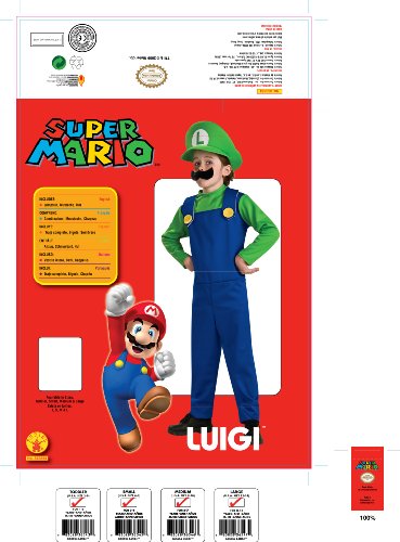-. Binding : Toy -. Brand : Rubie's -. Color : Super Mario Brothers Luigi -. Department : boys -. Feature : Costume features jumpsuit with blue overalls, big yellow button and attached green long sleeve shirt / Also includes hat, mustache and gloves / Hand wash in cold water and dry flat / Toddler fits size 2 to 4 / Officially licensed costume -. Label : Rubies - Domestic -. Manufacturer : Rubies - Domestic -. Model : 883654T-PARENT -. MPN : 90003563 -. PackageQuantity : 1 -. PartNumber : 90003563 -. ProductGroup : Toy -. ProductTypeName : CHILDRENS_COSTUME -. Publisher : Rubies - Domestic -. Size : Small -. Studio : Rubies - Domestic -. Title : Rubie'S Super Mario Luigi Costume