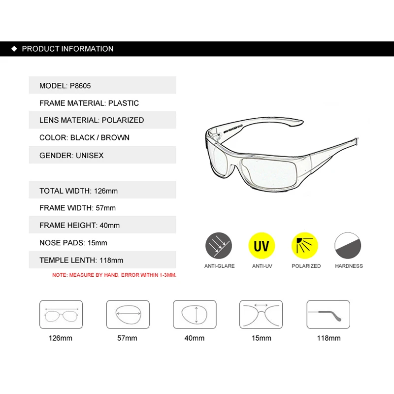 Lenses Optical Attribute: UV400,Polarized Function: Anti UV400,Reduce Glare,Goggle,Fashion Accessories Frame Feature: Stylish Comfortable And Not Easily Deformed Frame Hinges: Reinforced High Quality Hinges Nose Pads: English Style Nose Pieces Size: One Size Fits All Suitable For Face: Round Face Long Face Square Face Oval Face Usage Scope: Driving,Fishing,Party,Fashion Show,Outdoor Sports