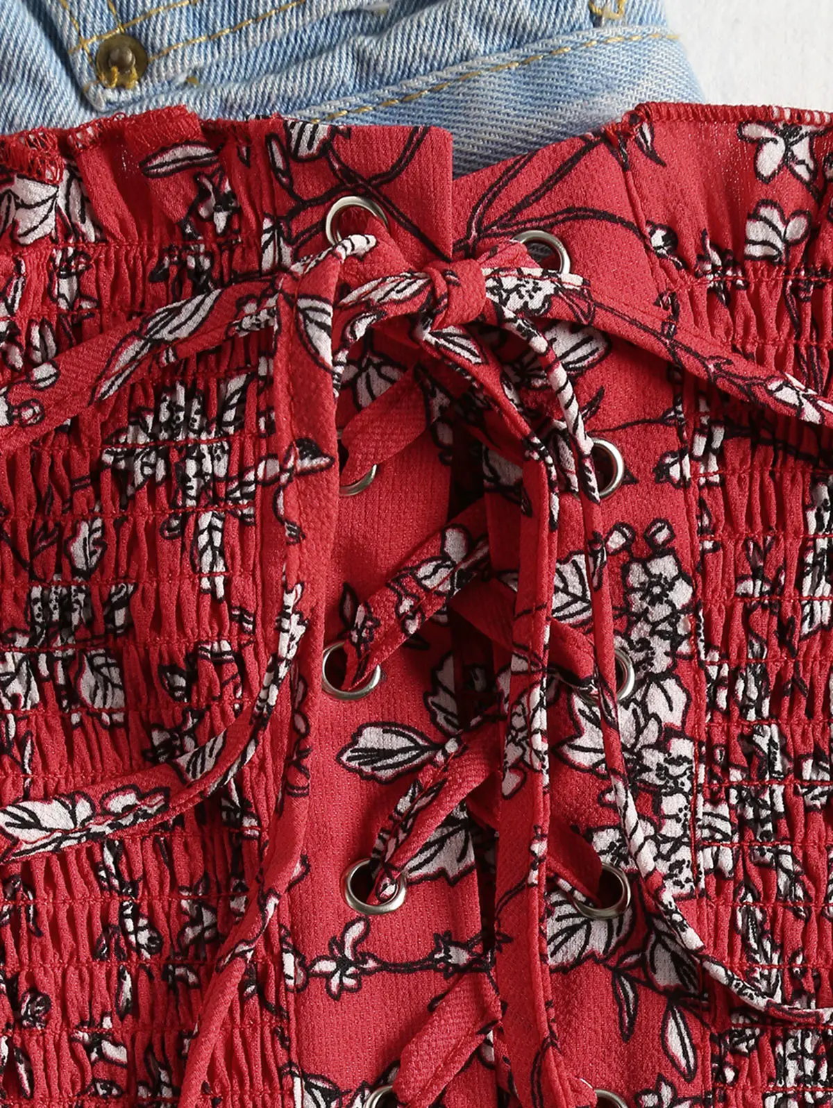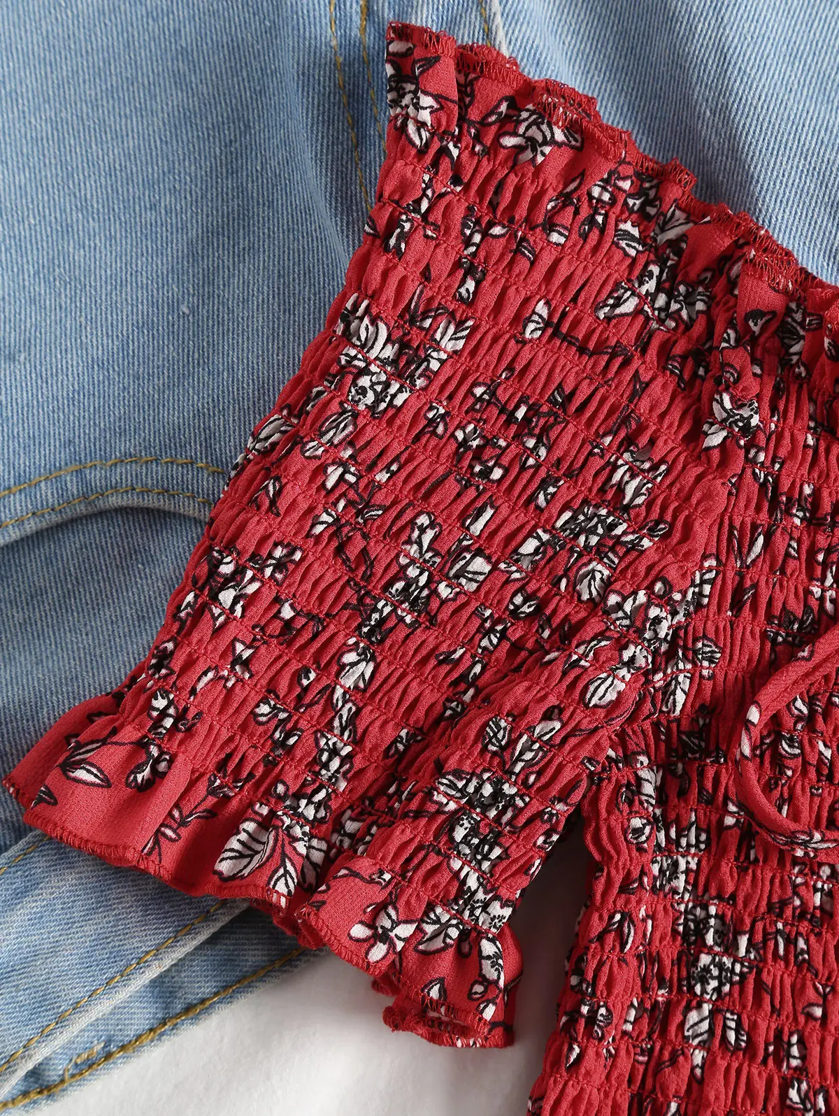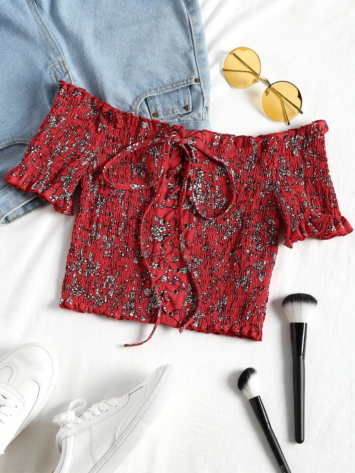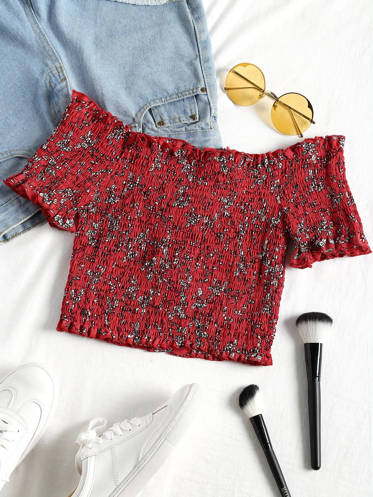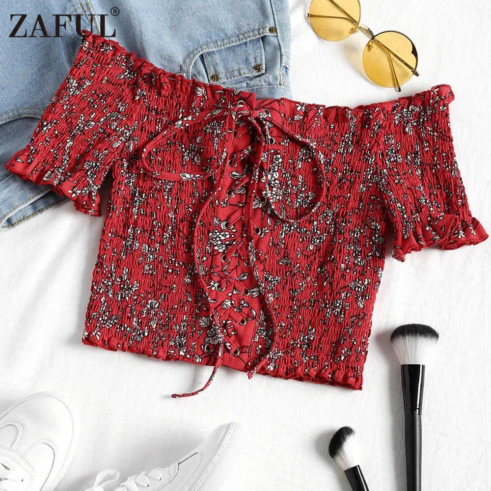 Model Number:Cropped Floral Shirred Off Shoulder Top