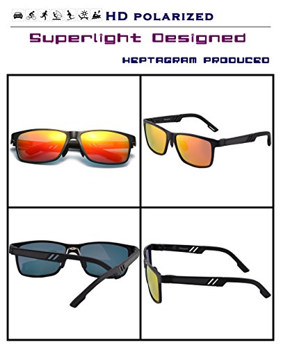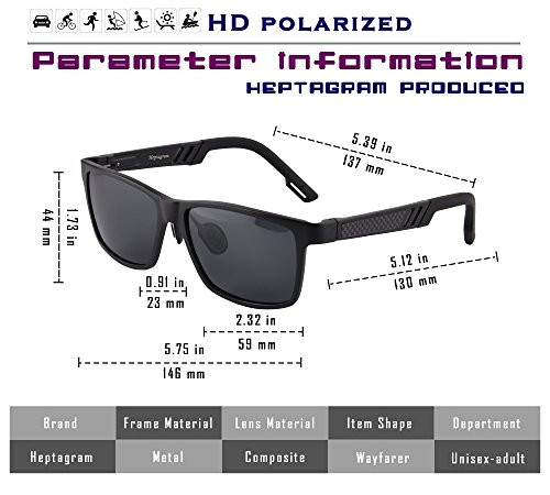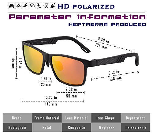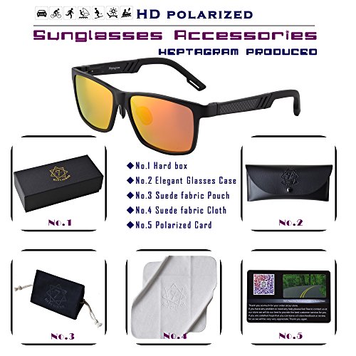 -. Feature : 【Polarized Lens】---- Blocks the harmful sun's rays from damaging your eyes which can cause deep wrinkles, cataracts, macular degeneration, and cancer in and around the eye. / 【Al-Mg FRAME】 - Al-Mg Alloy is P.R.Ized for its combination of lightness and strength.You can hardly feel them on your face, but they are unbreakable.Best for motorcycle and cycling bicycle, driving, running, fishing, racing, skiing, climbing, trekking or other outdoor activities / 【COMFORTABLE TO FIT ALL FACE SHAPE】 - SP.R.Ing assisted hinge make these sunglasses comfortable to wear, even for large face;Fashion Smart design to fit your face curve and absolute comfort for everyday wear;Ergonomic and super sturdy design ensures premium performance and comfort / 【PERFECT GIFT FOR MOST OCCASIONS】 - Each Heptagram sunglasses are packed in Premium Portable Case and Exquisite Eyewear Box,along with Pouch and Cleaning Cloth etc.If you want to give this as a gift, all the hard work is done for you and you can just pop them into a gift bag and be done / 【30 DAY MONEY BACK GUARANTEE】 - All Heptagram customers enjoy 30 Day Money Back Guarantee. Customers can return and get refunded in case the purchasing is not satisfactory for any reason. You have no risk to try and we will provide you the best service!