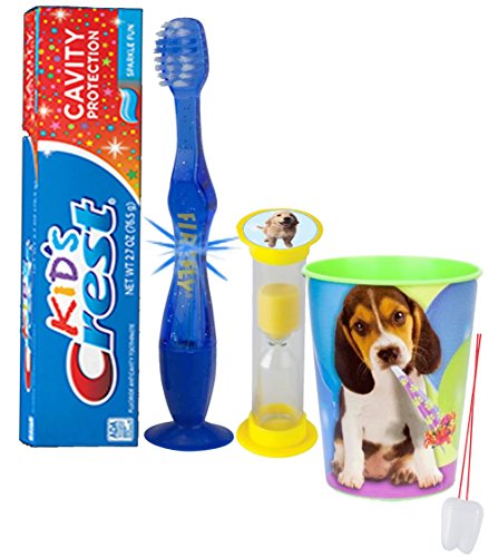 -. Feature : Turn something your kids have to do into something they want to do...Because when brushing is fun, it gets done! / (1) Firefly Youth Flashing Lights Suction Cup Toothbrush (Assorted Colors) (1) Kids Crest Cavity Protection Sparkle Fun Toothpaste, 2.7 oz / (1) Puppy Dog 16 Oz Mouthwash Rinse Cup! Doubles As Toothbrush Holder! / (1) Dentist Recommended 2 Minute Puppy Themed Brushing Timer (Assorted Styles) / Plus Bonus "Remember to Brush" Visual Aid Tooth Saver Necklace. Hang it in their bathroom or by their bed so they remember to keep their chompers sparkly fresh. You could also use these tooth charms to save one of your child's baby teeth.