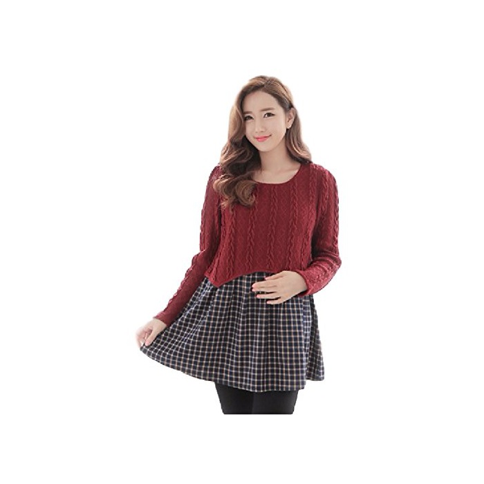(Miwoluna) 마타니티 튜닉 원피스 니트 스커트 체크 무늬 수유구 있음