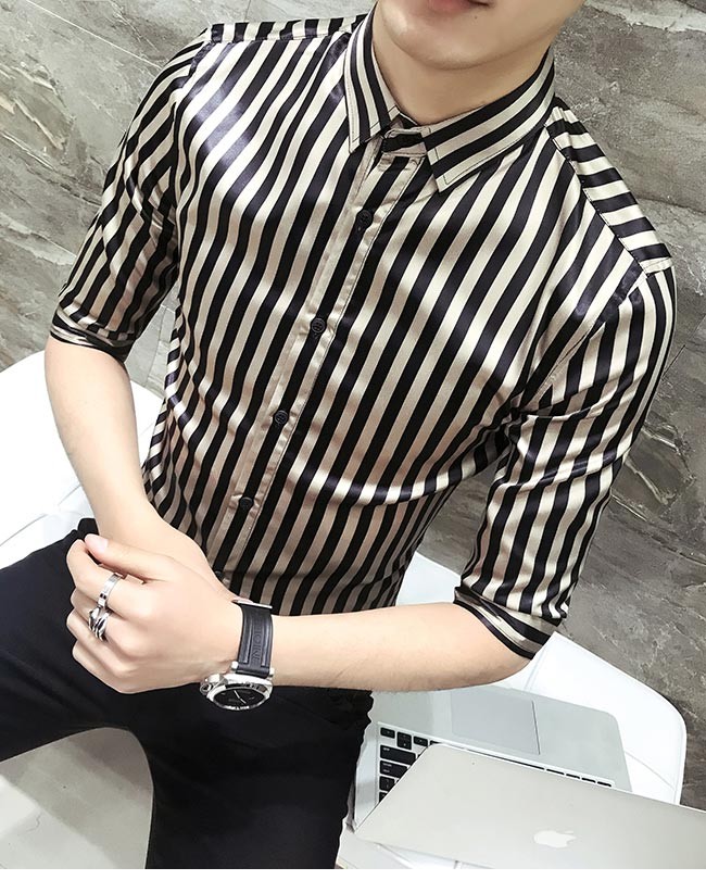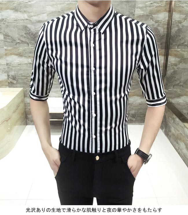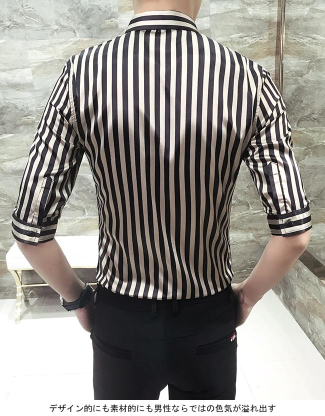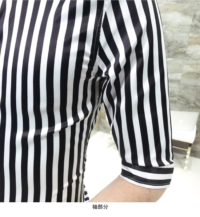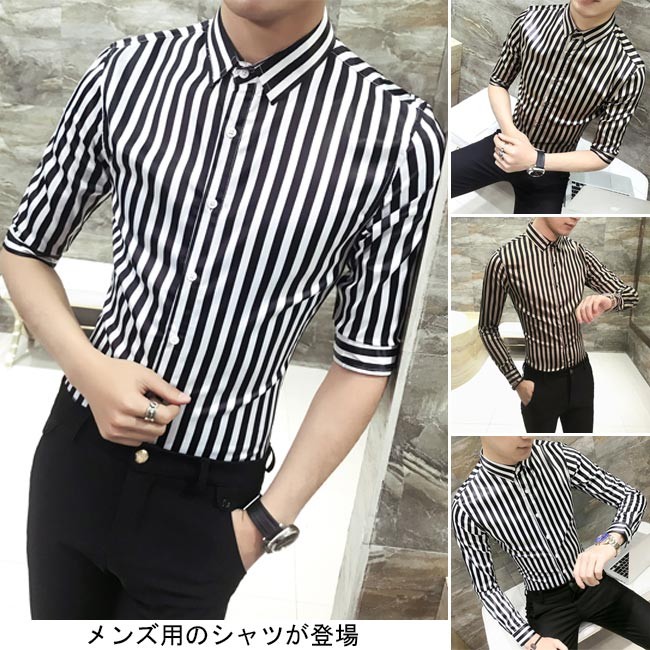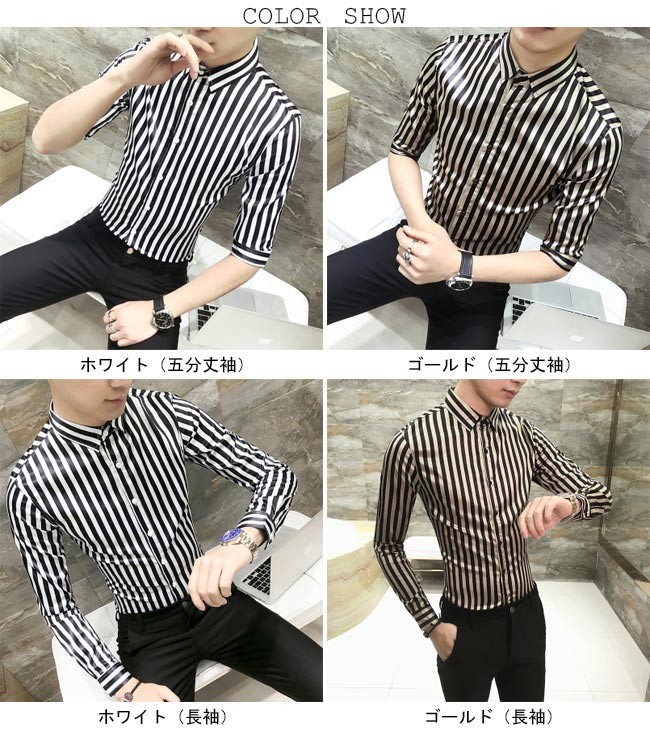 メンズシャツ ストライプ柄 スリムシルエット 2タイプ 長袖 五分丈袖 男性用 シャツ タイト セクシー 夏物 春秋物 トップス 薄手メンズ用のシャツが登場スッキリとしたストライプ柄にスリムなシルエットでとてもボディーラインを引き立てる光沢ありの生地で滑らかな肌触りと夜の華やかさをもたらすデザイン的にも素材的にも男性ならではの色気が溢れ出す五分丈袖と長袖の2タイプが用意され、需要次第で選べるカラー:ホワイト(五分丈袖) ゴールド(五分丈袖) ホワイト(長袖) ゴールド(長袖)素材 ポリエステルサイズ(cm) M L XL 2XL 3XLM バスト92 着丈67 肩幅42L バスト96 着丈69 肩幅43XL バスト100 着丈71 肩幅442XL バスト104 着丈72 肩幅463XL バスト108 着丈74 肩幅48ご注意:※サイズは平置きサイズです。素人採寸ですので、若干の誤差がございます、ご了承ください。