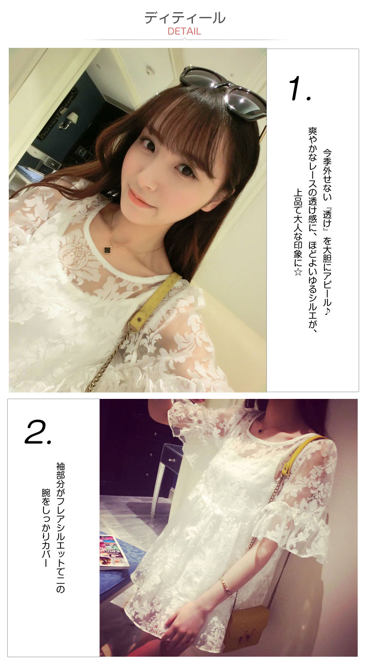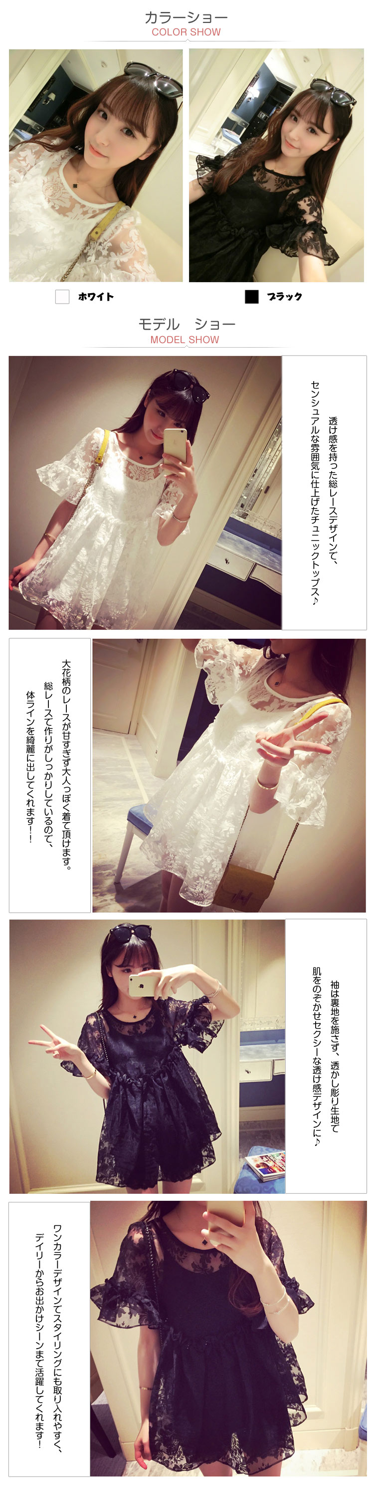 | 透け感を持った総レースデザインで、センシュアルな雰囲気に仕上げたチュニックトップス♪大花柄のレースが甘すぎず大人っぽく着て頂けます。総レースで作りがしっかりしているので、体ラインを綺麗に出してくれます!!袖は裏地を施さず、透かし彫り生地で肌をのぞかせセクシーな透け感デザインに♪ワンカラーデザインでスタイリングにも取り入れやすく、デイリーからお出かけシーンまで活躍してくれます! | |