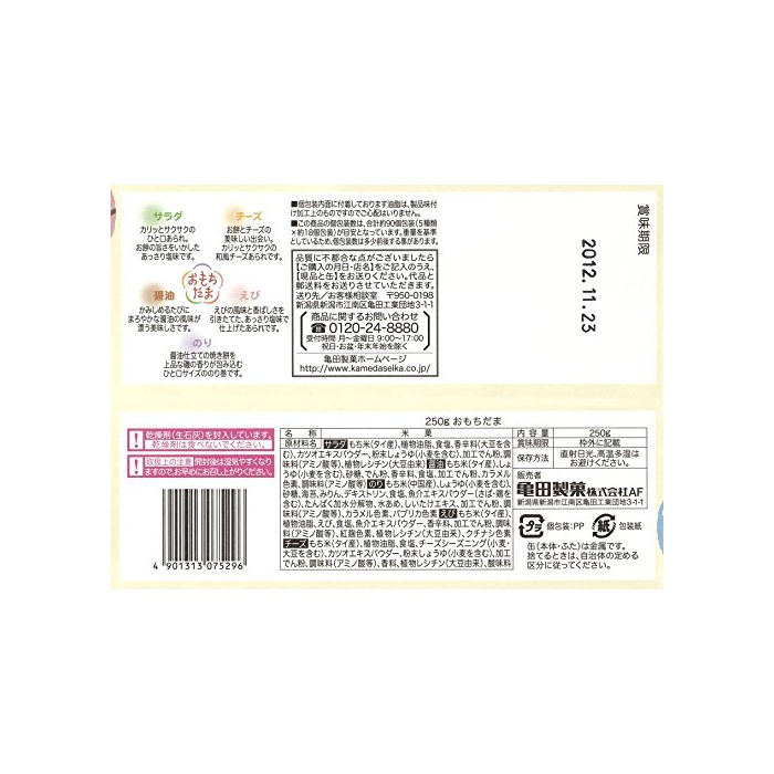 원재료:샐러드 찹쌀(타이산)고, 식물성 기름지,식염,향신료(대두를 포함한다)고, 가다랭이 엑기스 파우더 분말 간장(밀을 포함한다)고, 가공 나오지 않겠 분,조미료(아미노산등)고, 식물 레시틴(대두 유래) 간장 찹쌀(타이산)고, 간장(밀을 포함한다)고, 설탕,나오지 않겠 분,향신료,식염,가공 나오지 않겠 분,카라멜 색소,조미료(아미노산등) (풀/모범/직경)해초 찹쌀(중국산)고, 간장(밀을 포함한다)고, 설탕,김,미림,덱스트린,식염,생선 및 조개류 엑기스 파우더(하면 닭을 포함한다)고, 담백 가수분해물,물엿,하여 있어 뛰어나 엑기스,가공 나오지 않겠 분,조미료(아미노산등)고, 카라멜 색소,파프리카 색소 새우 찹쌀(타이산)고, 식물성 기름지,새우,식염,생선 및 조개류 엑기스 파우더,향신료,가공 나오지 않겠 분,조미료(아미노산등)고, 홍국색소,식물 레시틴(대두 유래)고, 치자나무 색소 치즈 찹쌀(타이산)고, 식물성 기름지,식염,치즈 seasoning(밀 대두를 포함한다)고, 가다랭이 엑기스 파우더,분말 간장(밀을 포함한다)고, 가공 나오지 않겠 분,조미료(아미노산)고, 향료,식물 레시틴(대두 유래)신맛료