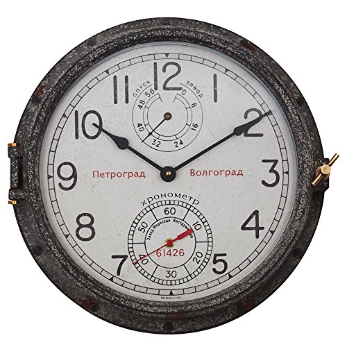 -. Feature : Possibly the most critical instrument on any ship of the day, the Petrograd Wall Clock's vintage dial from a Russian naval chronometer is held securely within an authentic weathered metal case with a solid brass knob and screws / Cyrillic script graces the main dial and a high visibility red seconds hand and subdial are used to grab the accurate time from a distance / Steel case with glass lens, 16.5"