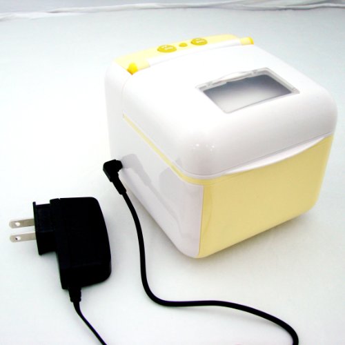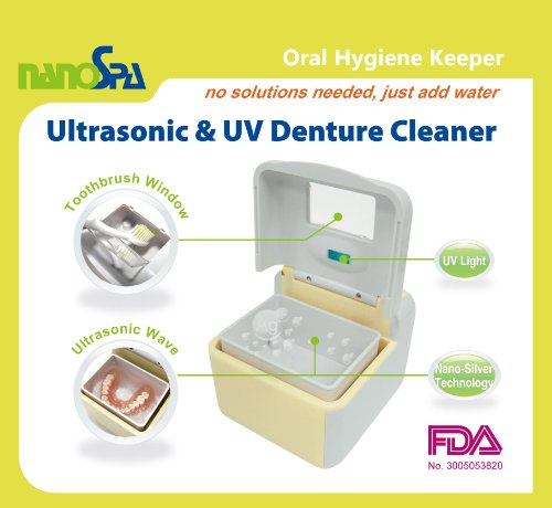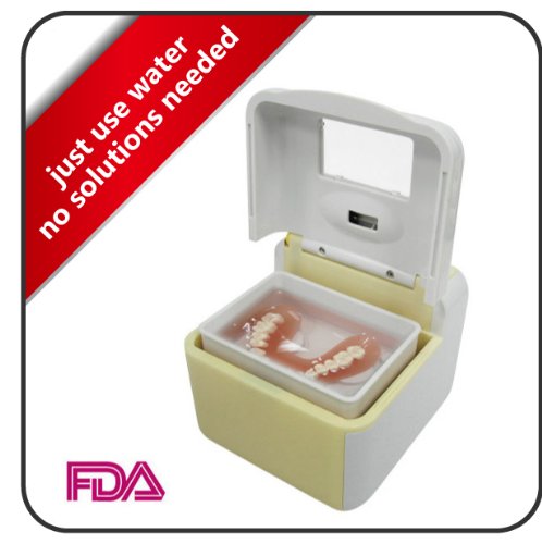 -. Feature : No Solutions needed, just add water. Ultrasonic vibration reaches up to 18,000 times per minutes to remove stains from and object placed inside the container. / UV Light deodorize, sterilize, and disinfect most of microorganisms and bacteria. All parts from Japan. 100% made in Taiwan. / Built-in energy saving function which turns off the power automatically after 20 minutes of use. Power turns off when the lid of the device is open during operation to protect eyes from seeing the UV light directly. / The state-of-the-Art design of the lid of the device closes tightly by using magnets. The UV Denture Cleaner is small, light, easy managed, and portable, good for home use and travelling. / 1 years limited warranty. FDA Registered, CE Medical Approved. Over 350 units sold in the past 5 months.For the best results, most dentists also sest that our customers clean their dentures one at a time. If you put two dentures together to clean, the 18,000 times per minute vibration might cause them rub together and eventually lead to grinding.
