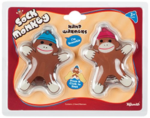 -. Binding : Toy -. Brand : Toysmith -. EAN : 0085761166035 -. Feature : Self-heating, reusable hand warmers-NOT for use in a microwave / Provides up to 30 minutes of heat with a simple click / Reset them in boiling water to reuse / Adult supervision required / Ages 3 and up -. IsAdultProduct : 0 -. Label : Toysmith -. Manufacturer : Toysmith -. Model : 1123 -. MPN : 1123 -. PackageQuantity : 1 -. PartNumber : 1123 -. ProductGroup : Toy -. ProductTypeName : TOYS_AND_GAMES -. Publisher : Toysmith -. Studio : Toysmith -. Title : Toysmith Sock Monkey Hand Warmers, 2-Pack -. UPC : 085761166035 -. Warranty : 30 day warranty against manufacturer defects