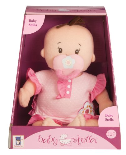 - Feature : This first nurturing baby doll is ultra soft, has cute, embroidered facial features, toes and belly button, and loves to cuddle / Dressed in a soft, pink onesie that is easy to take on and off, also includes a removable cloth diaper and pacifier that attaches magnetically / Features three sounds - giggling, sucking sound, and says "mama" when hand is squeezed, 2 AA batteries included / Inspires creative role play for a young child / From the multiple Award Winning Baby Stella Collection of soft, nurturing dolls and accessories