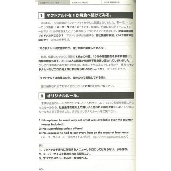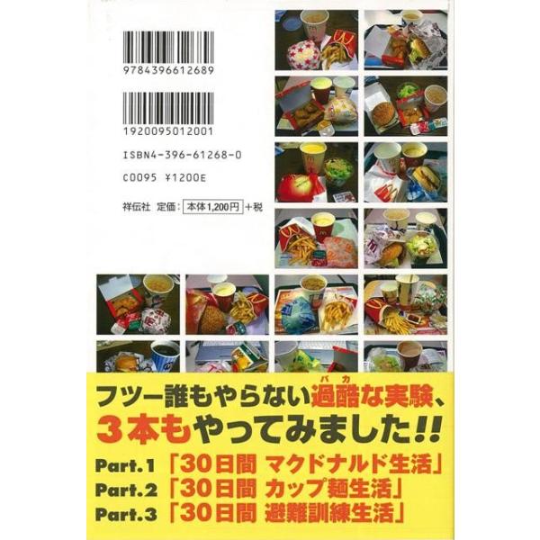 【商品説明】 定価(税込み):1,296円 値引き:10% OFF 映画『スーパーサイズ・ミー』に挑戦ジャンクフードは毒なのか?「30日間カップ麺生活」「30日間避難訓練生活」も実験しました。 バーゲンブック 新品 特価 格安 文芸 ノン フィクション ドキュメンタリー 生活 映画 |