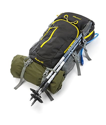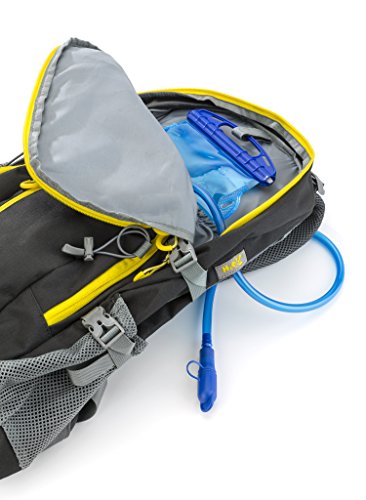 -. Feature : BREATHABLE COMFORT SUSPENSION FRAME - The stability of a framed pack, with a highly breathable back, comfortable wide shoulder straps, and just the right amount of padding on the shoulders, kidneys, and hips. The removable frame melds seamlessly with a durable, 600D rip-stop, water-resistant, machine washable bag. Also includes a small plastic cover in the hidden compartment at the bottom of the bag for those extra rainy days. / HIGH CAPACITY 3L BLADDER - large fill opening for ice cubes and to aid in cleaning. Strap inside to hold bladder in place. Mouthpiece cover to help keep it clean. / VERSATILITY, SAFETY, AND CONVENIENCE - Accommodates 33" to 60" waste, hip and net pockets can be easily accessed and hold everyday items. Various cinching straps, D rings, a bear whistle, loops, and attachment points are strategically placed on the bag and harness to maximize functionality: carry walking sticks, sleeping pad, ice axe, jacket or shell, etc. Side straps help maximize compression and stability. / TRAVEL - Dual opposable easy pull zipper loops on two largest compartments can be locked for travel. The bag meets most airline carry-on requirements. The main compartment can hold a large 17" screen laptop. The second compartment has a clip for your keys, and a couple net pockets to hold knickknacks. / CHARITY -50% of profits go to the charitable cause designated by that bag color: light grey with "wear your" pink trim (National Breast Cancer Foundation), dark grey with "support our troops" yellow ribbon trim (Wounded Warrior Project), royal blue with golden "gear" trim (Rotary International Charities).