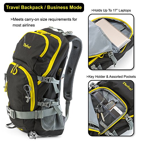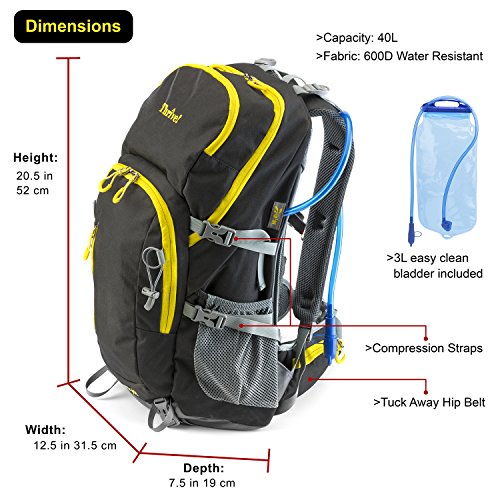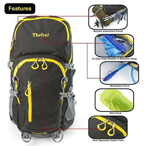 -. Title : Thrive! versatile 40L Backpack with breathable comfort suspension frame, 3-liter easy-clean water bladder, rain cover: hiking, travel, biking, trekking, laptop, charity
