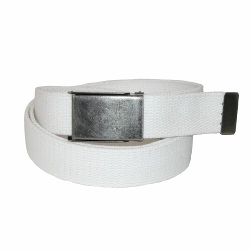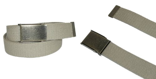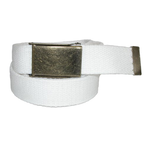 - Feature : Cotton web fabric / 1.25 inches wide / Clamp on Flip-Top buckle with matching tip / Adjustable up to 42 or 60 inches / Antiqued brass or antiqued nickel buckle