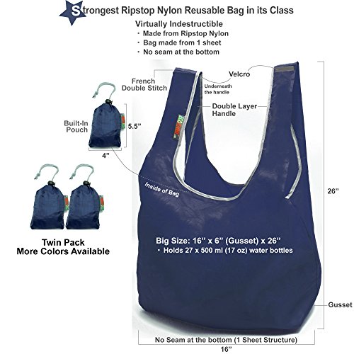 EcoJeannie 2 Pack Super Strong Ripstop Nylon Foldable Reusable Bag Grocery Shopping Tote Bag with built-in Pouch (Navy & Navy), RBS208